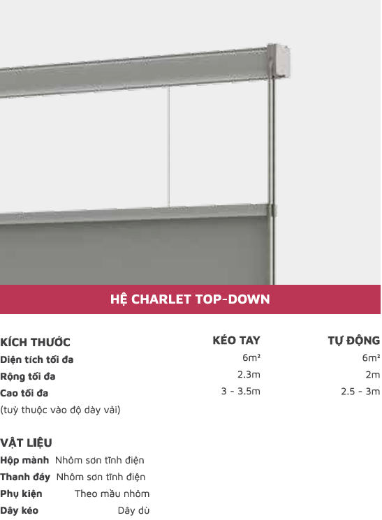- Hệ Charlet Top-Down: Cản sang hiểu quả, khả năng điểu chỉnh và kiểm soat ánh sáng tối ưu nhất. Ngoài khải năng lấy từ phía dưới, rèm roman hiện đại còn tích hợp hệ TOP DOWN có thể lấy sáng ở trên. Đây cũng là một trong những điểm cộng về sự sáng tạo của rèm roman.