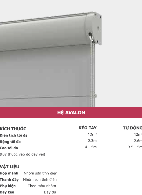 - Hệ rèm Avalon: Với kết cấu tối ưu hóa khoảng cách giữa hai lớp vải, mành Avalon Roman cho độ che sáng hoàn hảo nhất. Bên cạnh đó dòng rèm Avalon roman cũng hạn chế tối đa nếp nhăn của mặt vải do kỹ thuật không may vá. Thiết kế sang trọng cùng kiểu dáng hiện đại, Avalon Roman là sự lựa chọn tuyệt vời, phù hợp với mọi không gian sống trong ngôi nhà bạn.