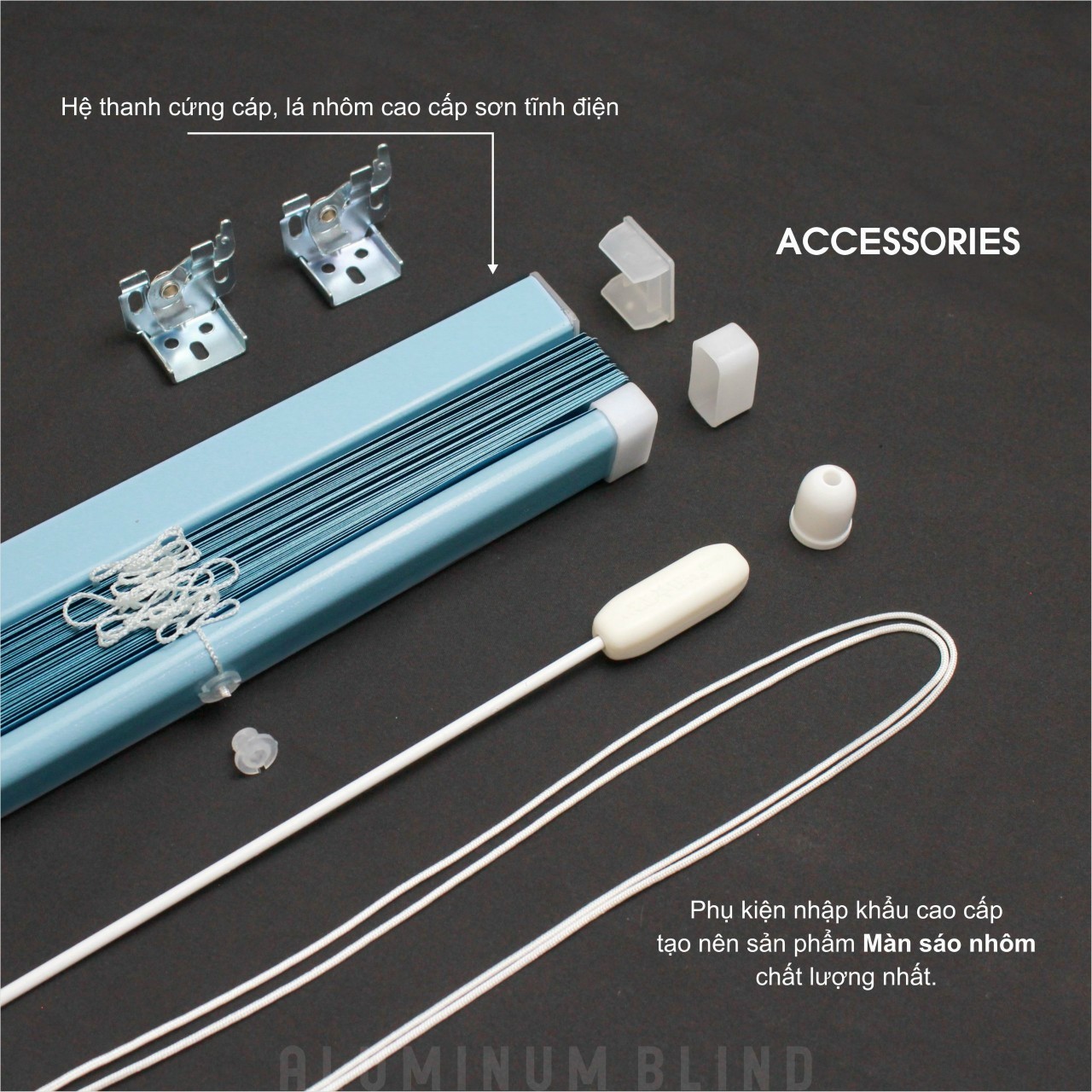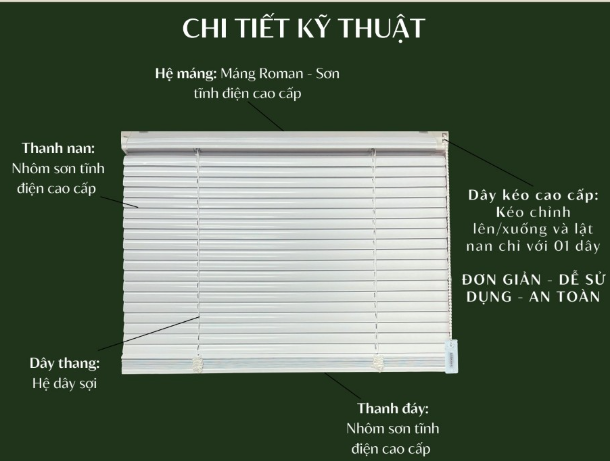 Rèm sáo nhôm được chế tác từ 100% nhôm sơn tĩnh điện cao cấp, mang đến độ bền bỉ và vẻ đẹp sang trọng cho không gian. Hệ thống cấu tạo thông minh bao gồm: