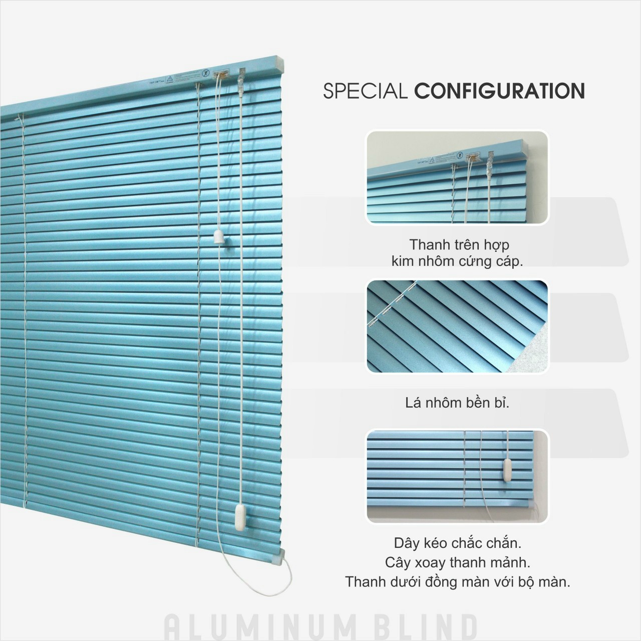 - Độ bền cao: Ngoài khả năng cản sáng, rèm sáo nhôm màu xanh ánh kim còn được ưa thích lựa chọn do đặc tính mềm dẻo, nhẹ và khó biến dạng trong quá trình sử dụng